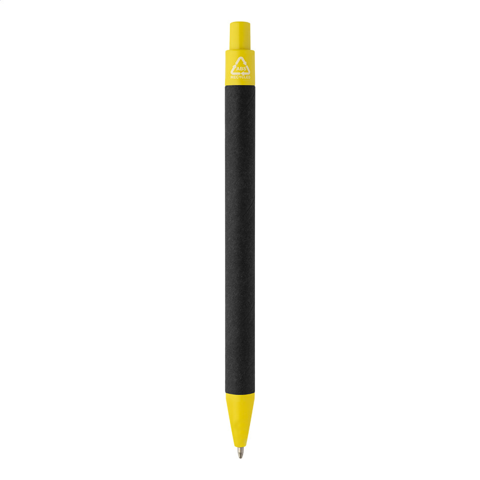 De Blapper geel is een ecologische balpen vervaardigd uit gerecycleerd papier, voorzien van een gele afwerking, zwarte behuizing en gerecyclede ABS-onderdelen. Schrijft in blauw inkt.