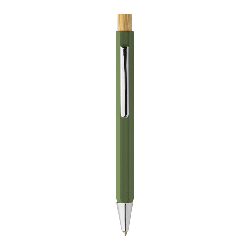 Zeshoekige groene balpen van gerecycled aluminium met bamboeknop en chromen onderdelen. Blauwschrijvend, geschikt voor dagelijks noteren en professioneel gebruik. Gewicht: 16 g.[1][2]