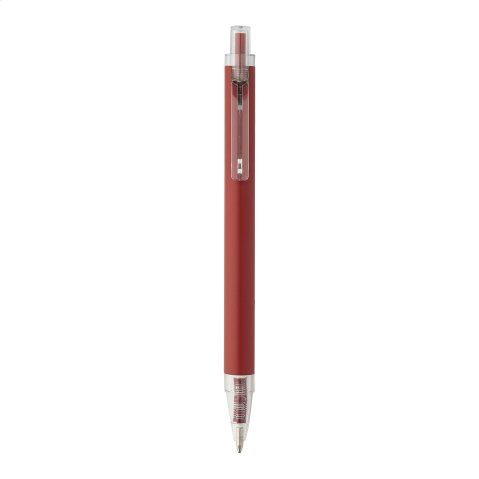 Gerecycleerde aluminium balpen in rood met matte afwerking en transparante RPET-onderdelen. Blauwschrijvend voor dagelijks gebruik in kantoor of promotie.