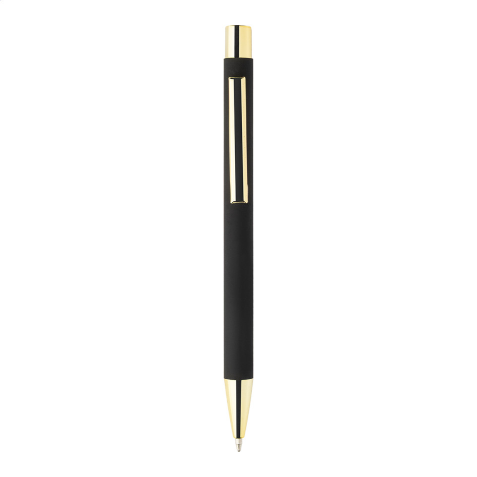 Gerecycleerde aluminium balpen met zwarte rubberen behuizing en goudkleurige glanzende metalen afwerkingsonderdelen. Blauwschrijvend en geschikt voor dagelijks noteren of professioneel gebruik.