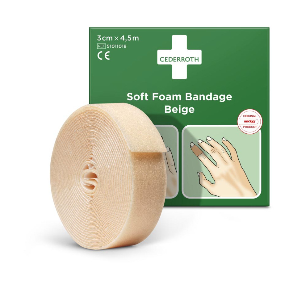 Het Cederroth zelfklevend schuimverband is een elastisch, waterbestendig verband van 3 cm breed en 4,5 meter lang in de kleur beige—ideaal voor eerstehulpbehandelingen van vingers, tenen en andere gewrichten waar flexibele ondersteuning nodig is.