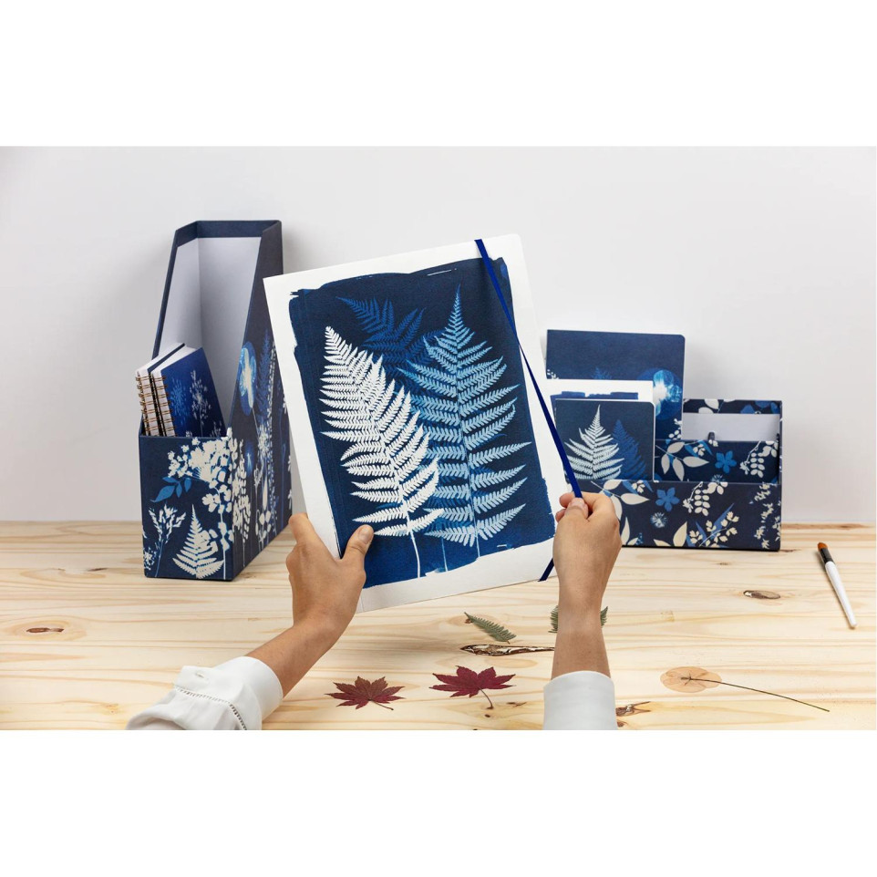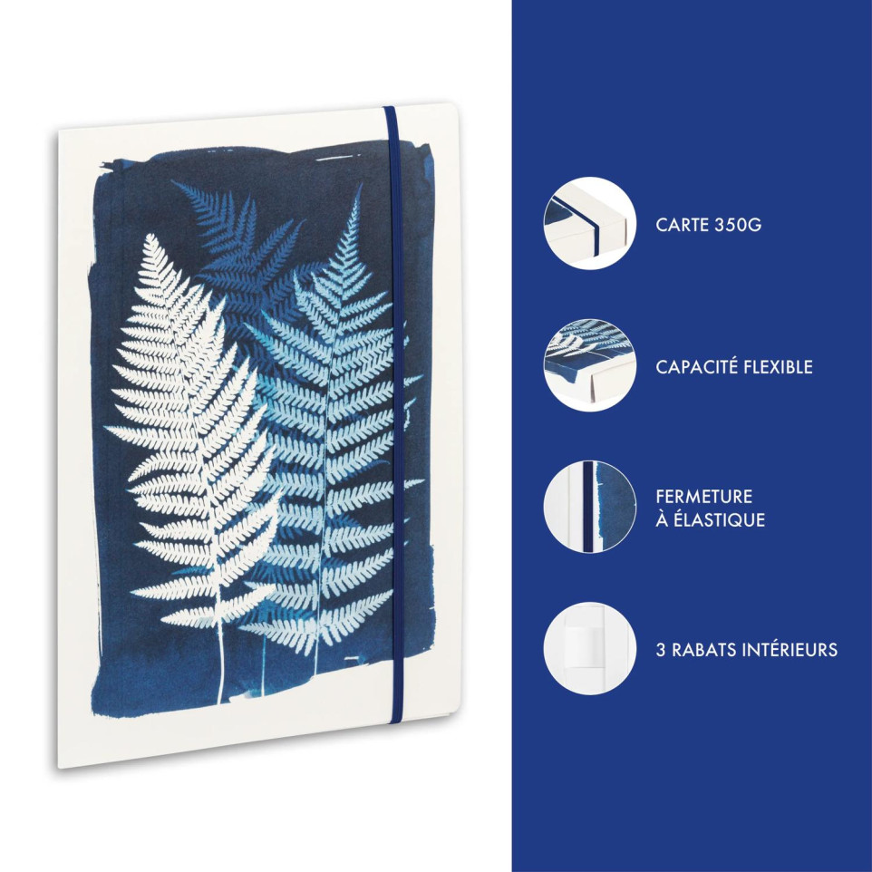 Cyanotype, elastomap 24x32 cm De onoverwinnelijke zomer brengt een eerbetoon aan het werk van Anna Atkins, een Engelse botaniste uit de 19e eeuw. Zij was de eerste die cyanotypie gebruikte om herbariums te creëren die de magische details van de natuur nauwkeurig vastleggen. Ontdek de bureauwereld van Cyanotype, producten ontworpen om je moeiteloos en stijlvol door elk moment van je dagelijks leven te leiden. Doordachte accessoires die functionaliteit en flair combineren, om je werkplek op te fleuren en je organisatie een stuk eenvoudiger te maken. 1 motief. Papier met een korrelstructuur voor een sobere en natuurlijke uitstraling.