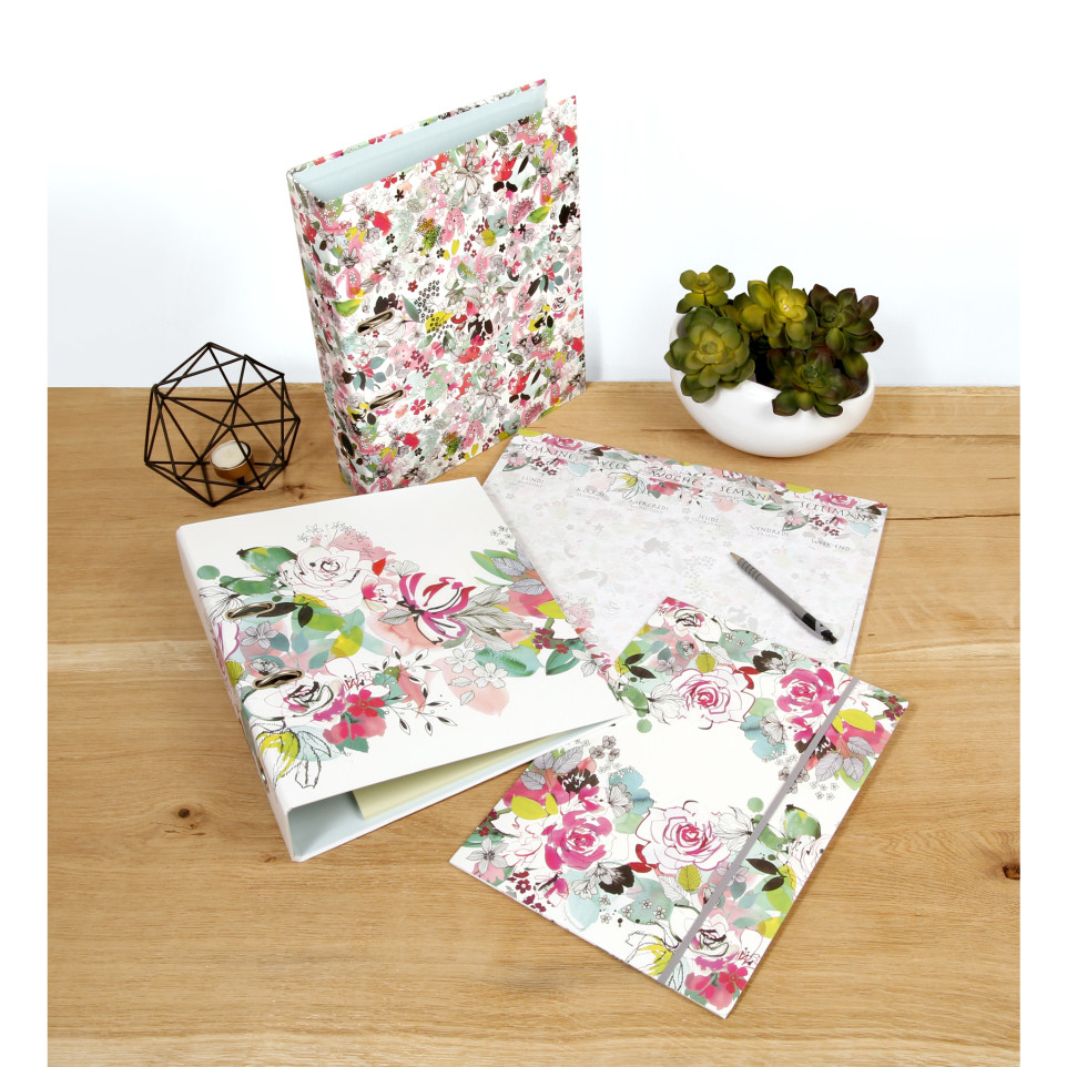Blooming, Chemise à élastique, 24 x 32 cm. La collection Blooming est une ode au printemps, comme un jardin foisonnant en pleine éclosion. On se promène, on flâne au milieu d'une végétation abondante qui respire la fraîcheur de verts mentholés, céladons, émeraudes, anisés... la douceur et la volupté des roses, pourpres...Elise Demozay aime travailler sur le motif floral et vous entraine dans une rêverie évanescente et lumineuse par la légèreté du trait et le fondu des couleurs aquarellées. C'est avec des encres colorées, diluées, des pastels, pinceaux, plumes et stylos à encre qu'elle crée sur du papier aquarelle de nouvelles couleurs, des ambiances végétales et graphiques. Impression sur carte, pelliculage mat, vernis sélectif, 1 visuel.