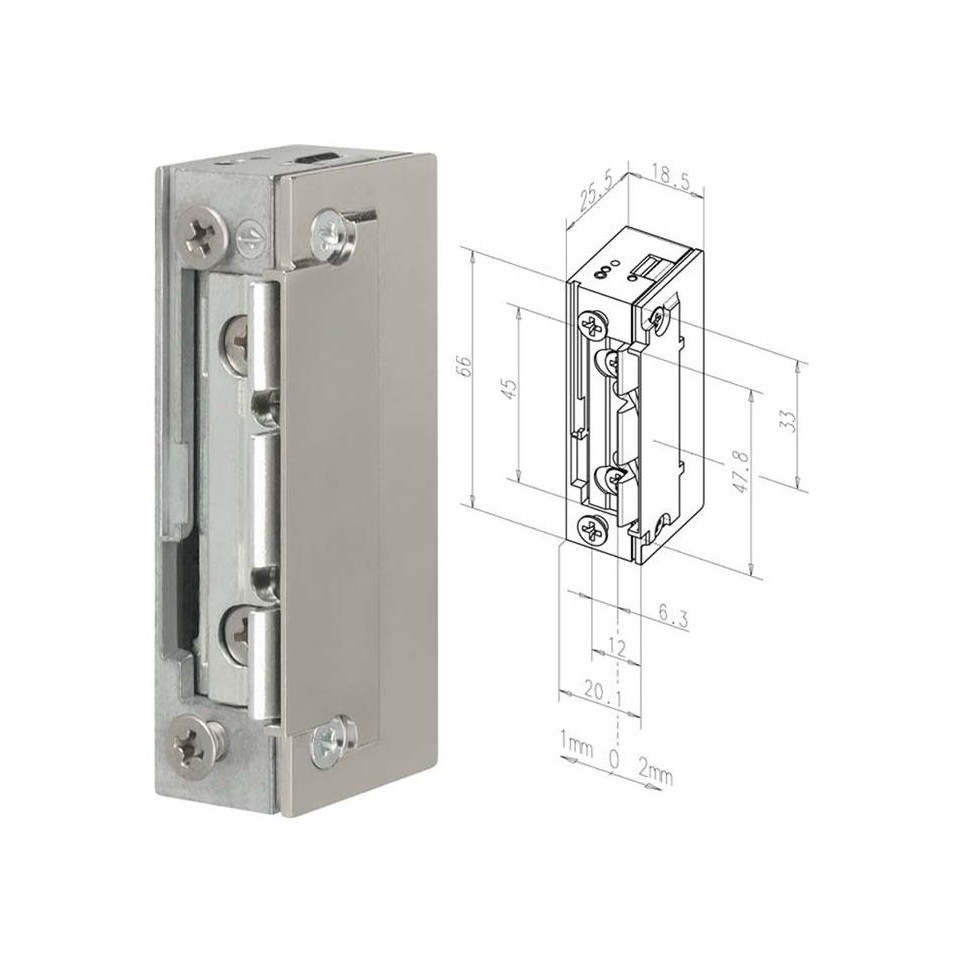 Smalle elektrische sluitplaat met symmetrische behuizing, ontworpen voor toegangscontrole en geschikt voor diverse toepassingen. De Effeff 118,53 ProFix2 werkt op 10-24 Vac/dc, zonder voorplaat, perfect inzetbaar bij zowel DIN links/rechts als horizontaal gebruik.