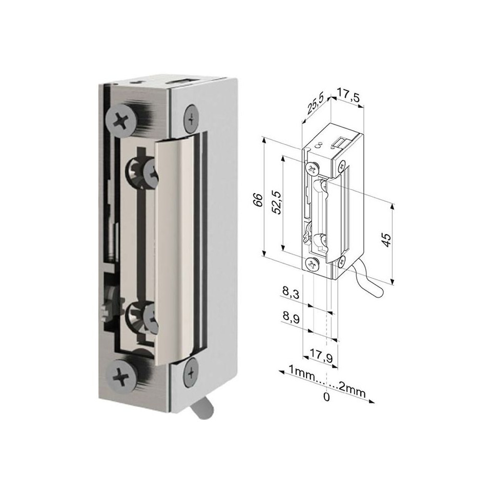 De Effeff 148WE is een smalle, waterdichte elektrische sluitplaat met symmetrische behuizing, geschikt voor universeel gebruik in toegangscontrole. Ontworpen voor montage zonder voorplaat in combinatie met vrijwel alle gangbare insteeksloten, zowel DIN links/rechts als horizontaal.