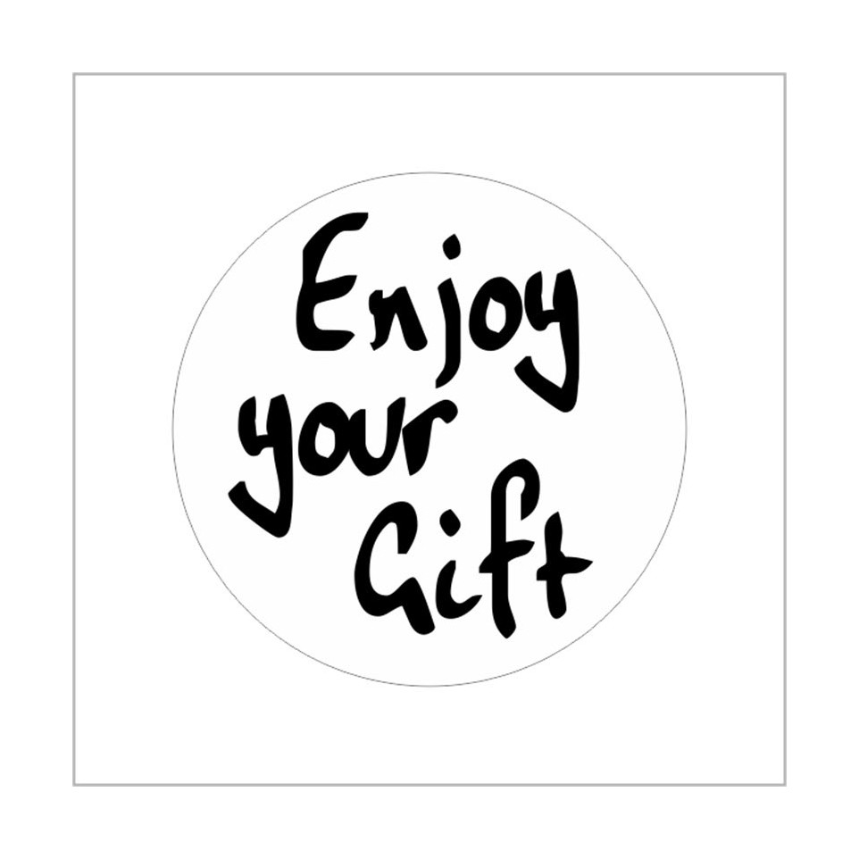 Ronde bedrukte etiketten met de tekst "Enjoy Your Gift", geleverd op rol met 500 stuks van 39 mm diameter. Ideaal voor het verfraaien en personaliseren van cadeaus, enveloppen of verpakkingen.