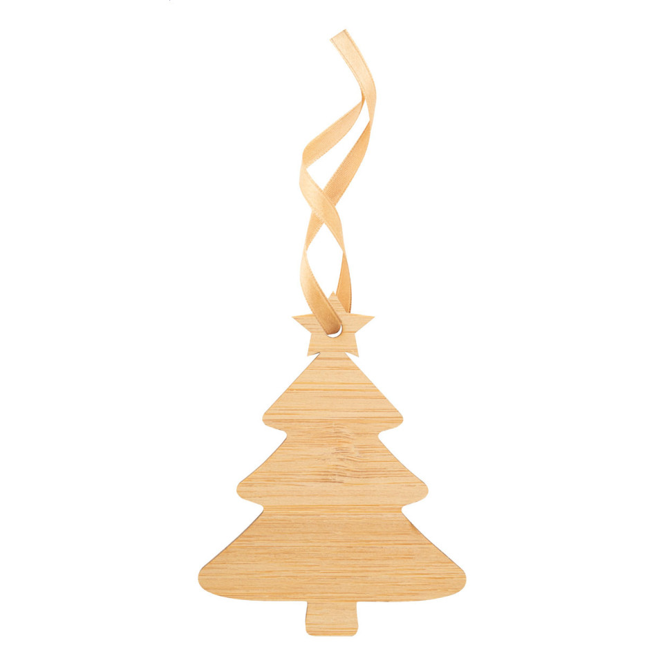 Bamboe multiplex kerstkaart met uitneembare kerstboom-ornament en los gouden lint. Inclusief C6-formaat envelop passend door de standaard brievenbus. Ideaal voor het versturen van unieke kerstgroeten en duurzame attenties.