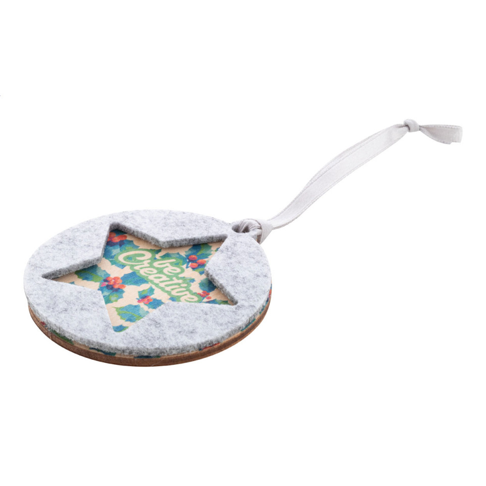 Bekijk producten in dezelfde categorieCreaFelt Tree grijs is een custom made dubbellaags kerstboomornament van RPET-vilt en berkenmultiplex, voorzien van een zilveren lint en een gestanste stervormige kerstdesign voor elegante en duurzame decoratie van evenementen of bedrijfsomgevingen.