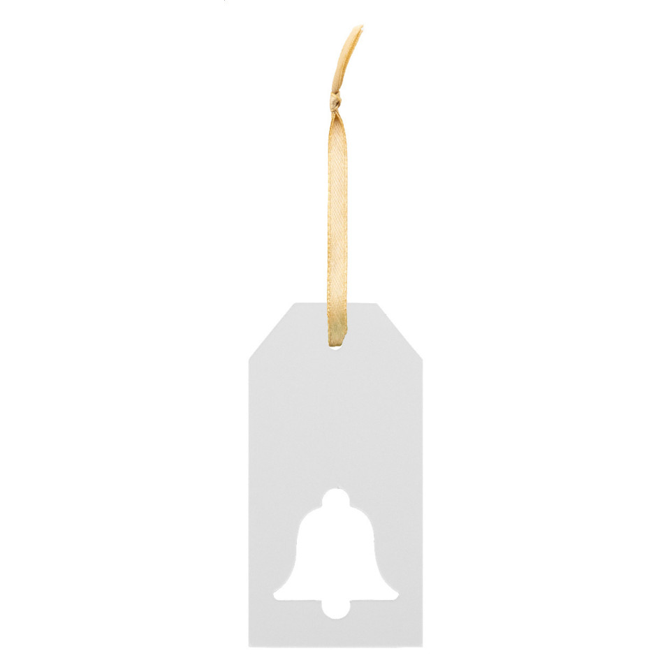 Papieren kerstcadeaulabel met full colour bedrukking, voorzien van een gestanst kerstmotief en een goudkleurig lint. Ideaal als unieke aankleding van geschenken tijdens evenementen of sportactiviteiten.