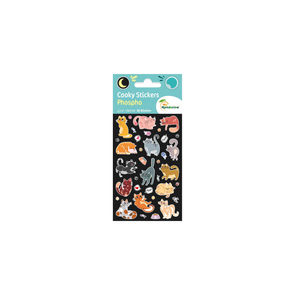 Cooky Phospho, Sach 1 pl 7,5x12cm, Chats Amusants et simples d'utilisation, ces petits stickers apporteront couleurs et volume à tous vos projets créatifs ou décorations. De jolis stickers 3D brillants et en relief ! Petit plus ces stickers sont phophorescents, ils brillent le jour et s'illuminent la nuit. Ces gommettes Cooky 3D sont parfaitement adaptées aux activités de scrapbooking, carterie, dessin, peinture ou simplement pour décorer son journal intime, sa coque de téléphone ou ses livres et cahiers. Dimensions de la planche : 7,5x12 cm, dimensions de la pochette : 8x17 cm, Nombre de gommettes dans le sachet : 36, 1 planche. Conforme aux Normes CE, A partir de 4 ans. Ces gommettes développent la motricité, la dextérité et l'imagination de votre enfant.