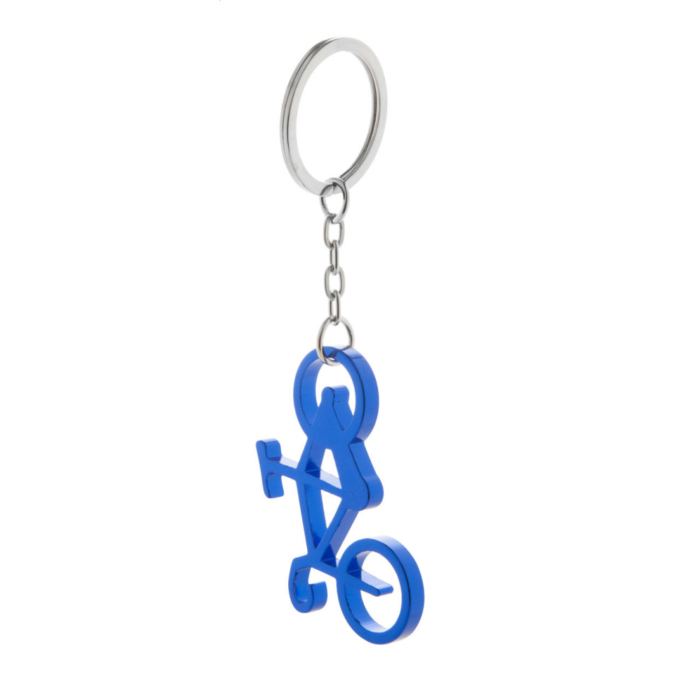 Compacte aluminium sleutelhanger in de vorm van een fiets, uitgevoerd in blauw. Ideaal voor dagelijks gebruik aan sleutelbos of rugzak en biedt tevens een handige flesopener voor onderweg of bij sociale gelegenheden.