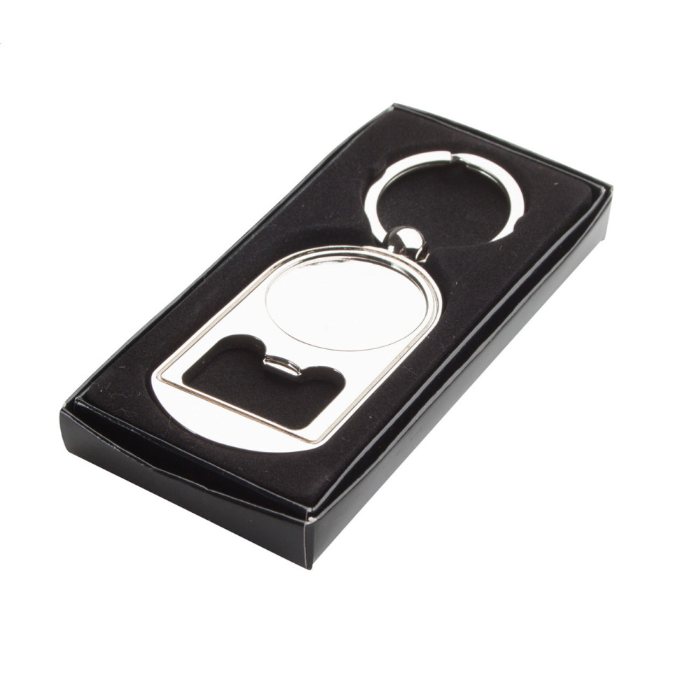 Praktische metalen flesopener met sleutelhanger en epoxy doming, geleverd in een zwarte geschenkdoos. Compact formaat van 35 × 65 × 3 mm, ideaal als dagelijks accessoire voor onderweg of aan je sleutelbos.