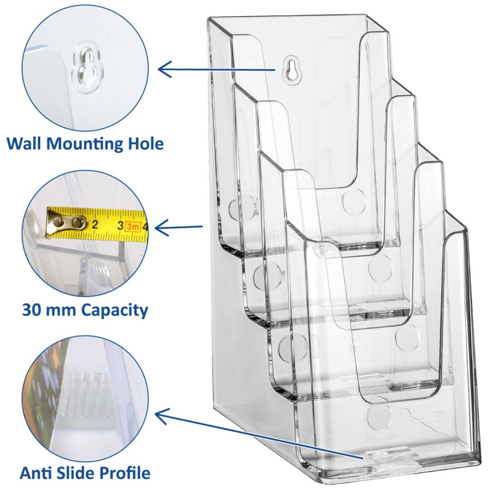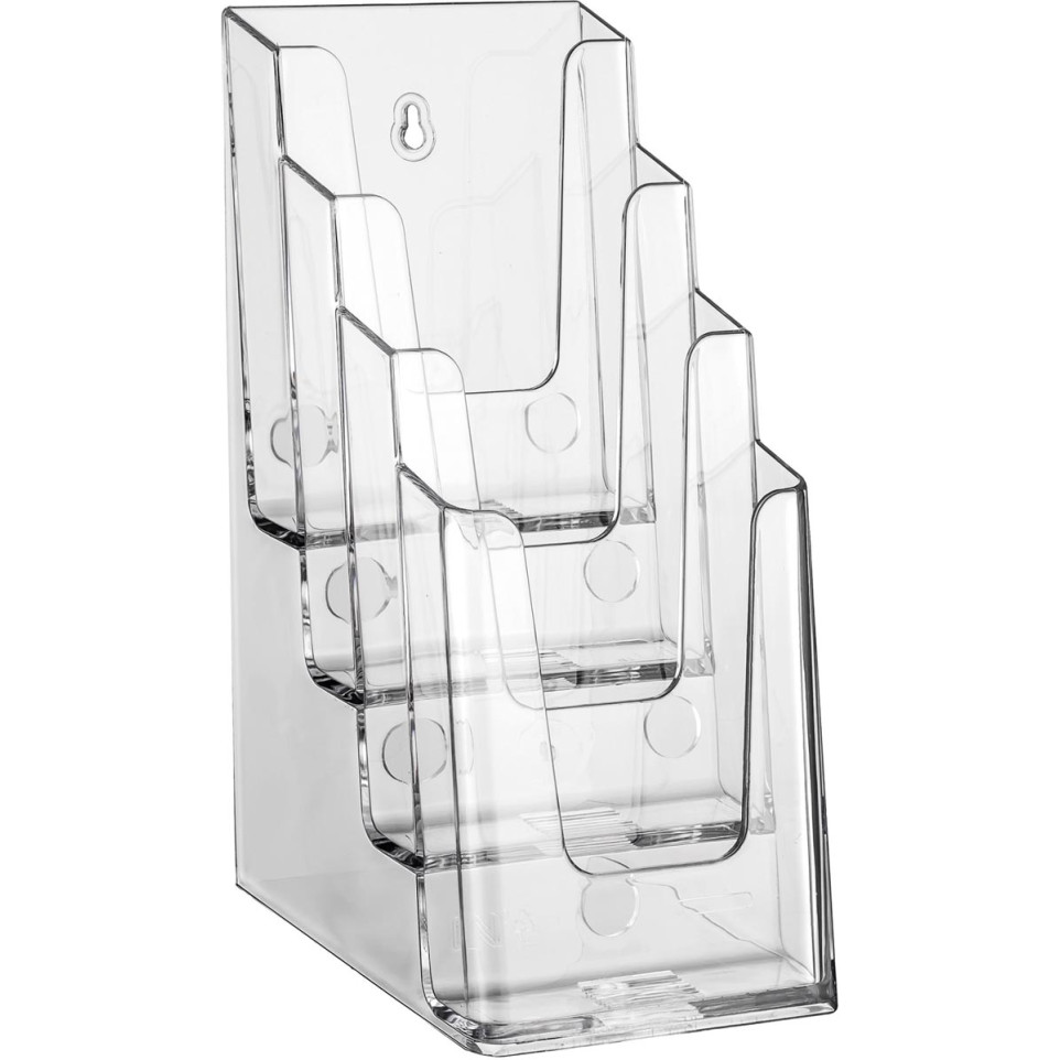 Plaats eenvoudig folders of flyers in de vier afzonderlijke vakken. Geschikt voor 1/3 A4-formaat, zoals DIN Lang brochures. Dankzij de heldere uitvoering blijven documenten goed zichtbaar en overzichtelijk, zowel op de balie als aan de muur.