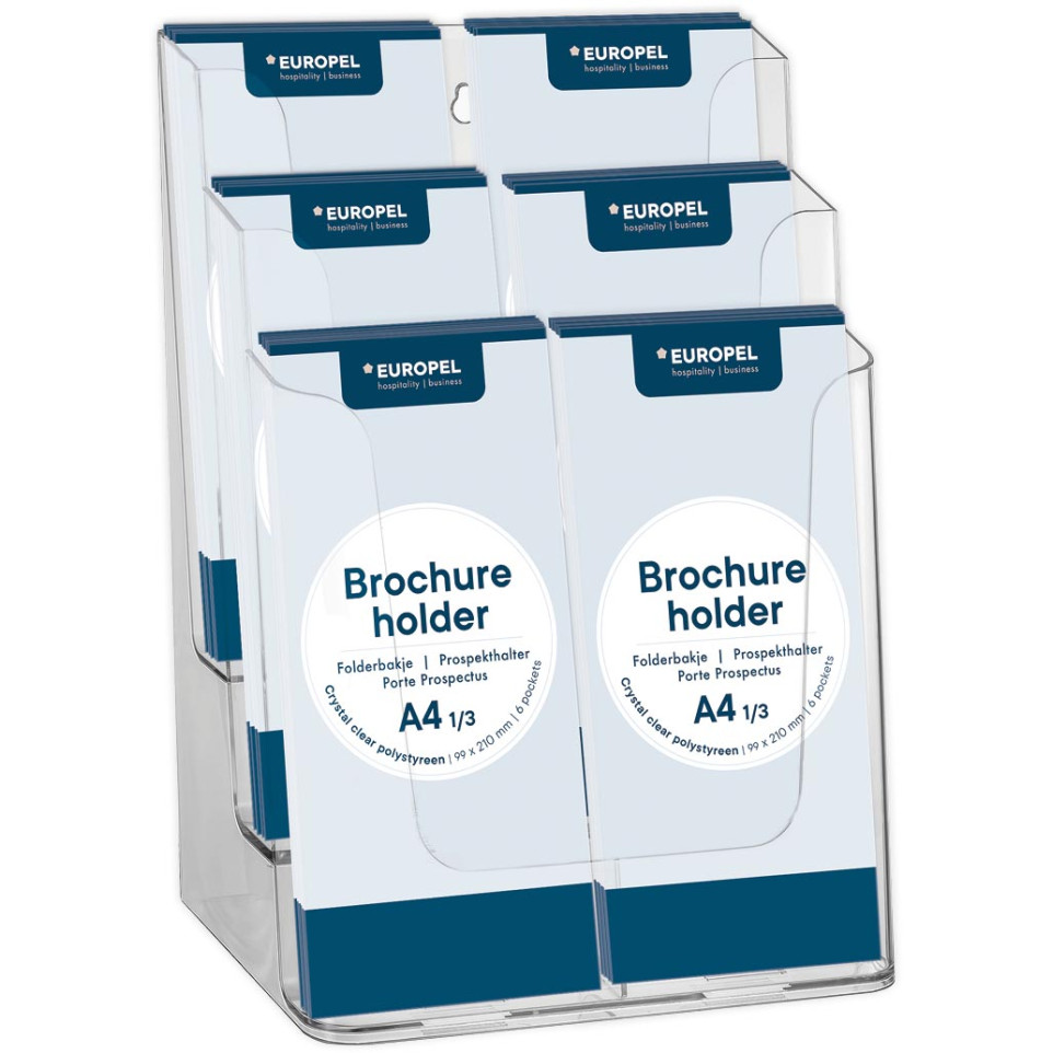 De Europel folderhouder is geschikt voor het ordenen en presenteren van documenten in kantooromgevingen. Het product is vooral nuttig voor het houden van A4-formaat papier in een ordelijke en visueel aantrekkelijke manier.