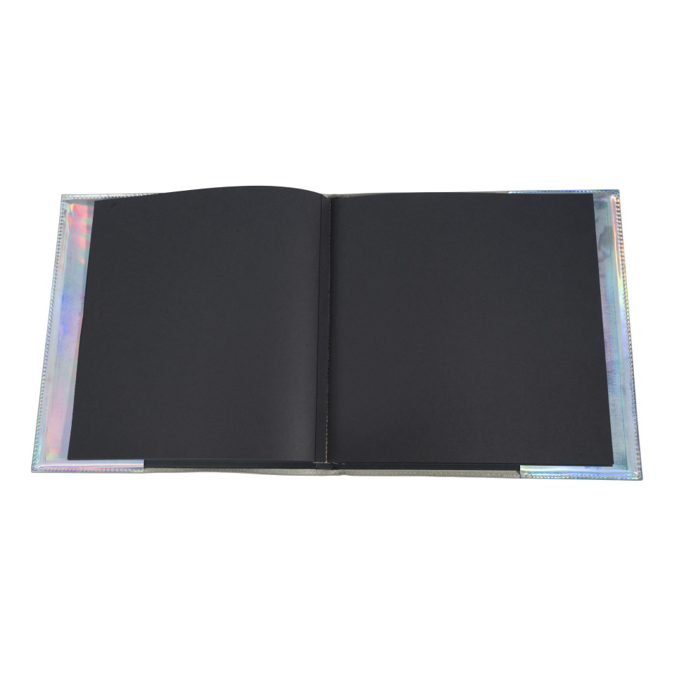 Fotoalbum boekgebonden - 30 zwarte bladzijden - 25x25 cm - GLOSSY Een fotoalbum die niet onopgemerkt blijft! Een modern en elegant album met zilverkleurige holografische beschermende omslag. Ideaal voor het klasseren van de mooiste foto's van feestjes en vakantie. Het vierkante formaat met smalle rug, is ideaal om de kostbare momenten van het leven te bewaren. Zo compact en praktisch als een boek, met een grote capaciteit (60 foto's). De bladen van het album zijn in stevig zwart karton van 250g, archivereningskwaliteit voor een uitstekende bewaring van de foto's.