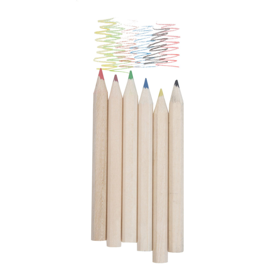 Set van 6 houten kleurpotloden in een papieren doosje, ideaal voor kleur- en tekenactiviteiten. Perfect voor kinderen en volwassenen die hun creativiteit willen uiten.
