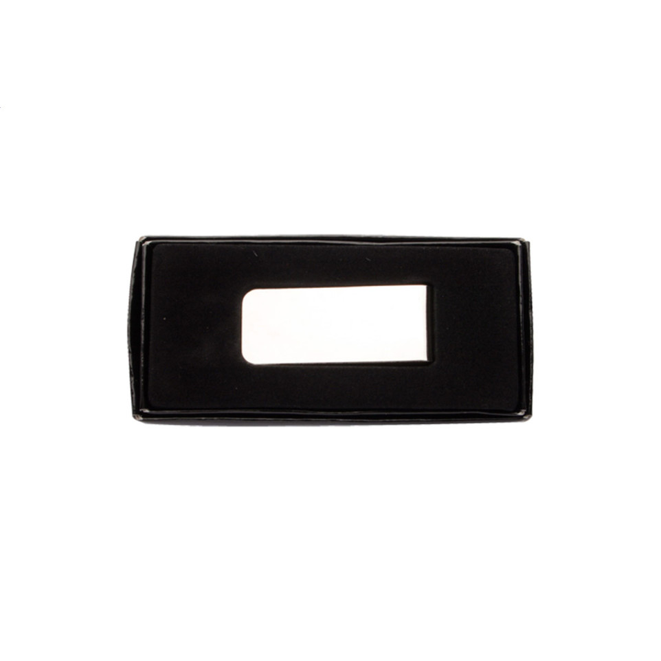 Compacte chromen geldclip met zilverkleurige afwerking, geleverd in een elegante zwarte geschenkdoos. Ideaal voor het veilig en stijlvol bewaren van bankbiljetten in zak of tas.