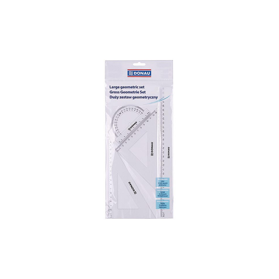 - Wat zit er allemaal in de DONAU tekenset geometric? De set bevat vier onderdelen: een liniaal van 30 cm, een winkelhaak van 45°/13 cm, een winkelhaak van 60°/18 cm en een gradenboog van 180°/10 cm, allemaal verpakt in een plastic ophangetui.