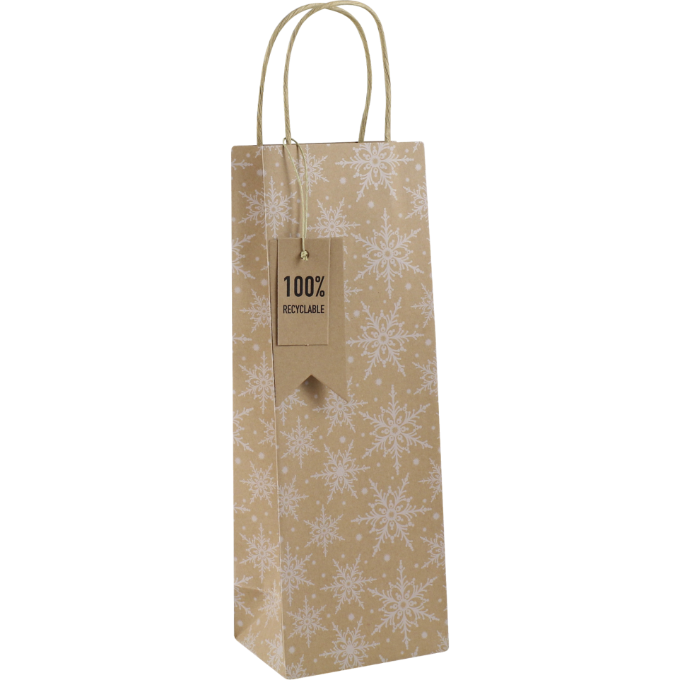 Kraft Flocons, sac bouteille 12,7x9x35,5 cm Un sac cadeau en papier kraft brun imprimé 210g, solide et opaque. L'impression foil est une technique de dorure à chaud permettant la création d'effets métallisés. Elle facilite la mise en relief de certains éléments du dessin et réhausse l'éclat du papier. Dimensions : 12,7x9x35,5 cm. Anses torsadées en corde assorties au sac pour le transporter facilement. Solides, elles supportent le poids de tous vos cadeaux, même les plus lourds. Un sac contemporain qui met en valeur votre cadeau. Pas besoin de scotch ou de bolduc, glissez votre cadeau simplement dans votre sac pour le valoriser et créer l'effet de surprise. Plus de perte de temps pour emballer artistiquement un cadeau aux bords asymétriques ! Le sac permet une présentation simple, rapide et esthétique. De très bonne qualité, il est solide et peut être réutilisé plusieurs fois. Une étiquette originale assortie au sac est fixée à la poignée. Elle vous permet de noter un message, votre nom ou celui du destinataire.