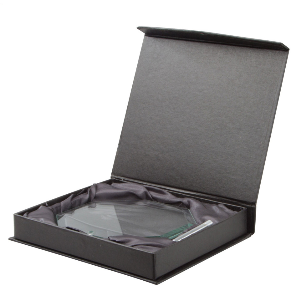 Achtkantige glazen trofee met houder, ontworpen als elegante bekroning voor prestaties. Geschikt voor prijsuitreikingen, jubilea of als symbolisch relatiegeschenk. Geleverd in een zwarte geschenkverpakking voor een professionele uitstraling.