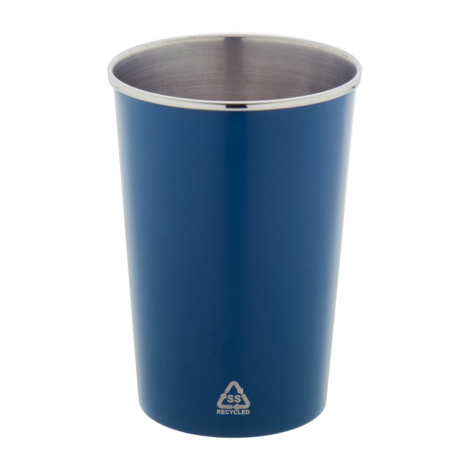 Redisha blauwe beker van gerecycleerd roestvrij staal met enkele wand. Met een capaciteit van 350 ml is deze duurzame beker ideaal voor dagelijks gebruik, outdoor activiteiten en bedrijfsevenementen.
