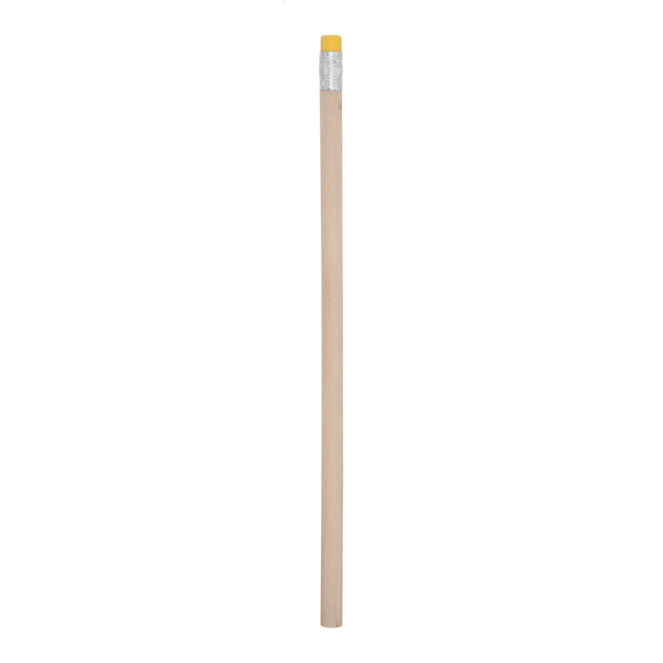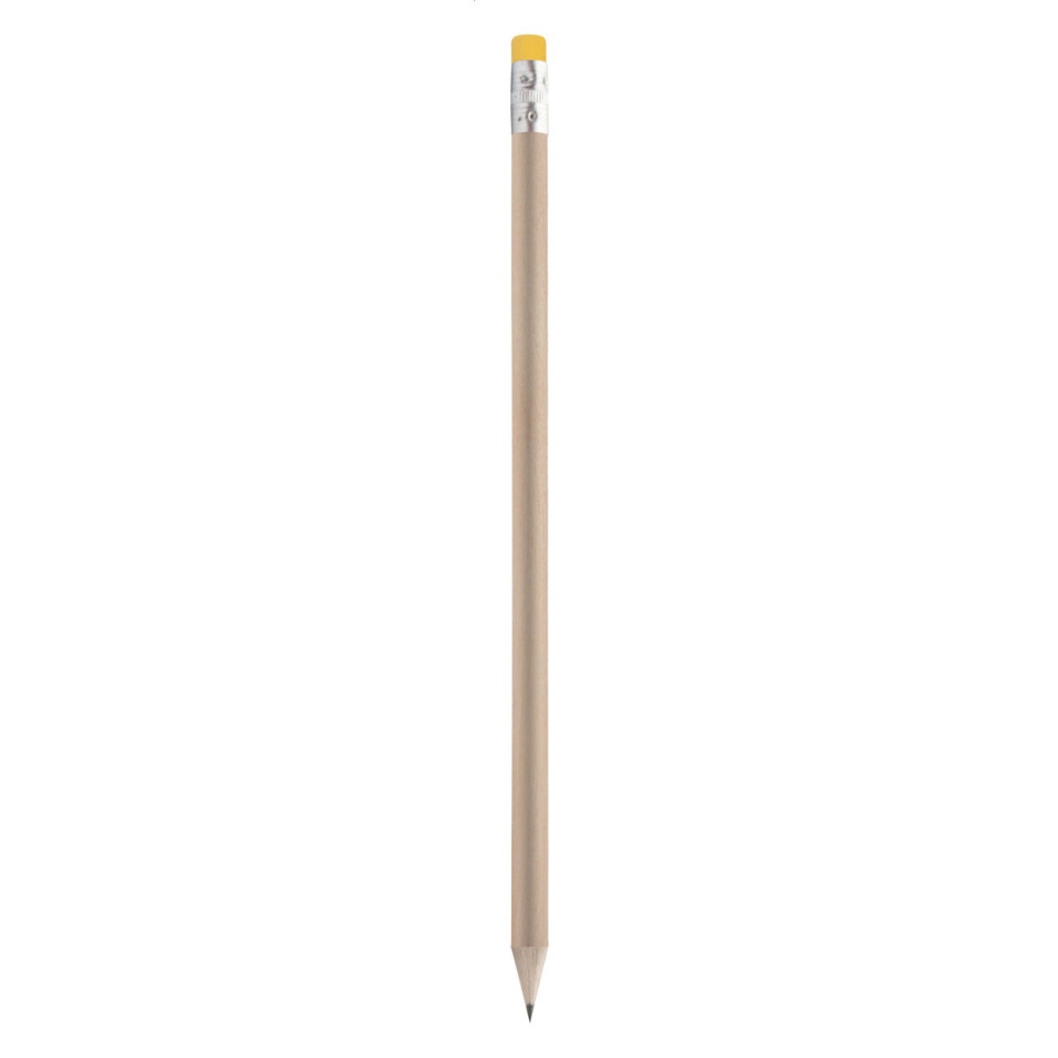 Praktisch houten potlood in natuurlijke kleur met opvallende gele gum. Ideaal voor dagelijks gebruik op kantoor, op school of als onderdeel van een promotiepakket. Niet geslepen en direct klaar om te bedrukken.