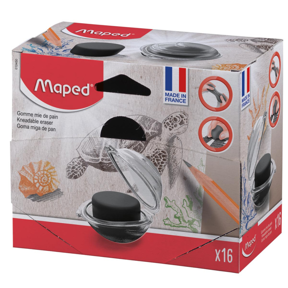 Blauwgrijze kneedgum van Maped in een doos van 16 stuks, speciaal ontworpen voor het grondig wissen en modelleren van pastel- en houtskooltekeningen. Ideaal voor kunstenaars, scholieren en tekenliefhebbers.