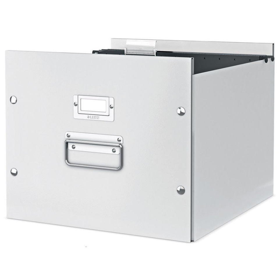 De Leitz Hangmappendoos Click & Store wit is een praktische opbergoplossing voor A4-hangmappen en ideaal voor georganiseerd en veilig bewaren van documenten op kantoor of thuis.