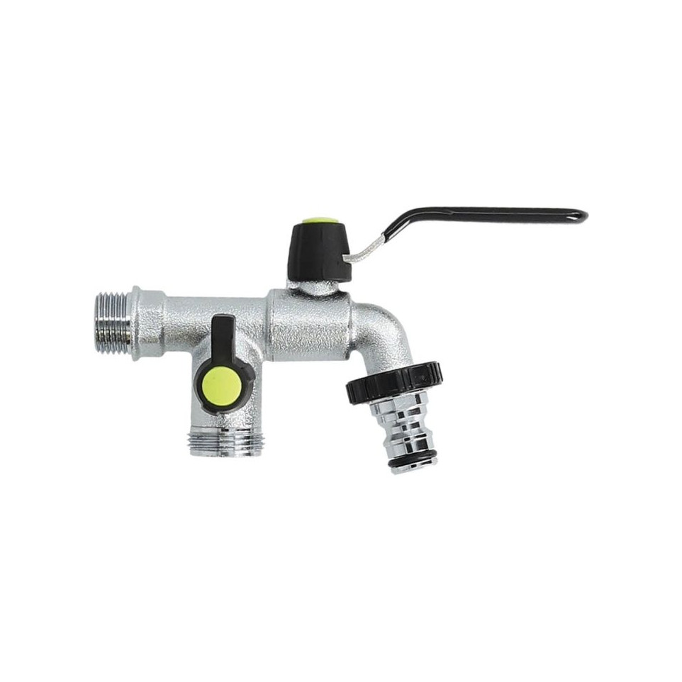 Dienstkraan 1/2'' - 3/4'' met dubbele uitloop is een robuust hulpsysteem voor het snel en veilig afsluiten of splitsen van waterstromen in technische installaties zoals tuinslangen, wasmachines of leidingwerk.