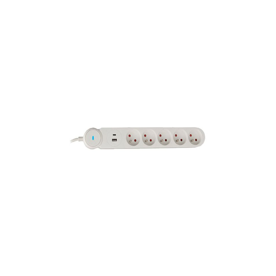 - 5 stopcontacten, 1 USB-A poort, 1 USB-C poort, witte kleur, kabellengte 1,5 m