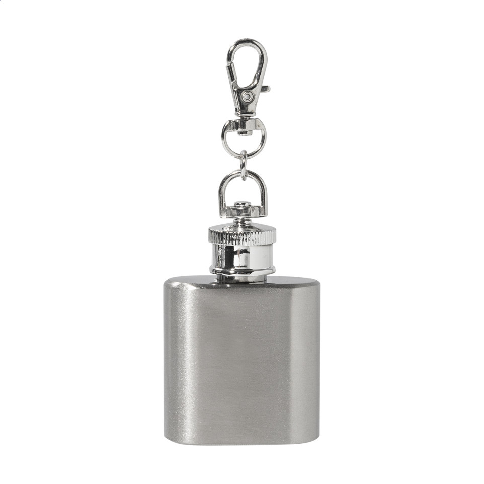 Compacte mini heupkolf van gerecycleerd roestvrij staal met een inhoud van 30 ml, voorzien van een praktische karabijnhaak waarmee het flesje eenvoudig aan een sleutelbos of tas bevestigd kan worden.