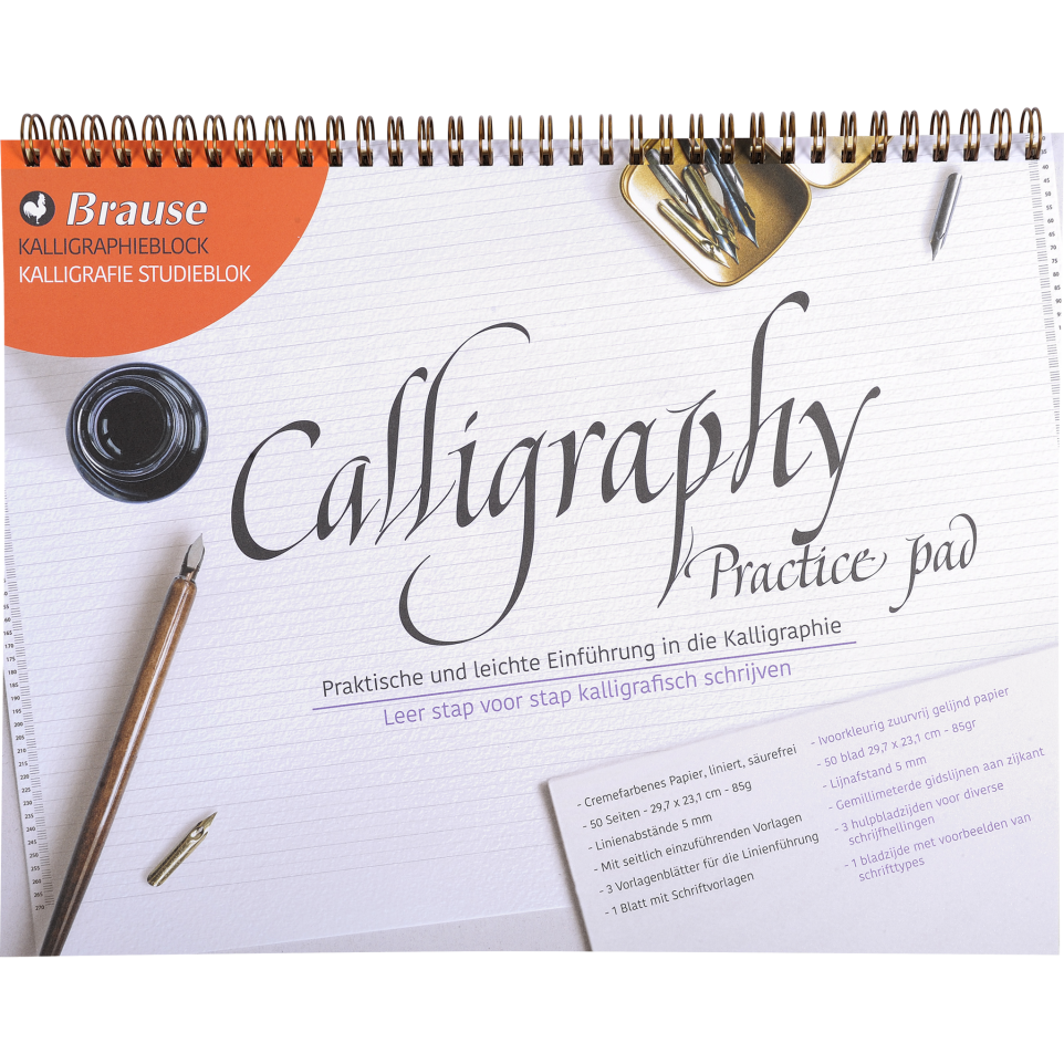 Studieblok voor Kalligrafie A4+, Duits/Nederlands 50 gelijnde bladen A4+, ivoorkleuirg papier van 90g. 3 pagina's met instructies voor het aanleren van de letterfonten. 1 pagina met voorbeelden. Ideale blok om te leren kalligraferen, individueel of in groep! Zuurvrij glad papier, voor een optimaal schrijfcomfort bij het kalligraferen.