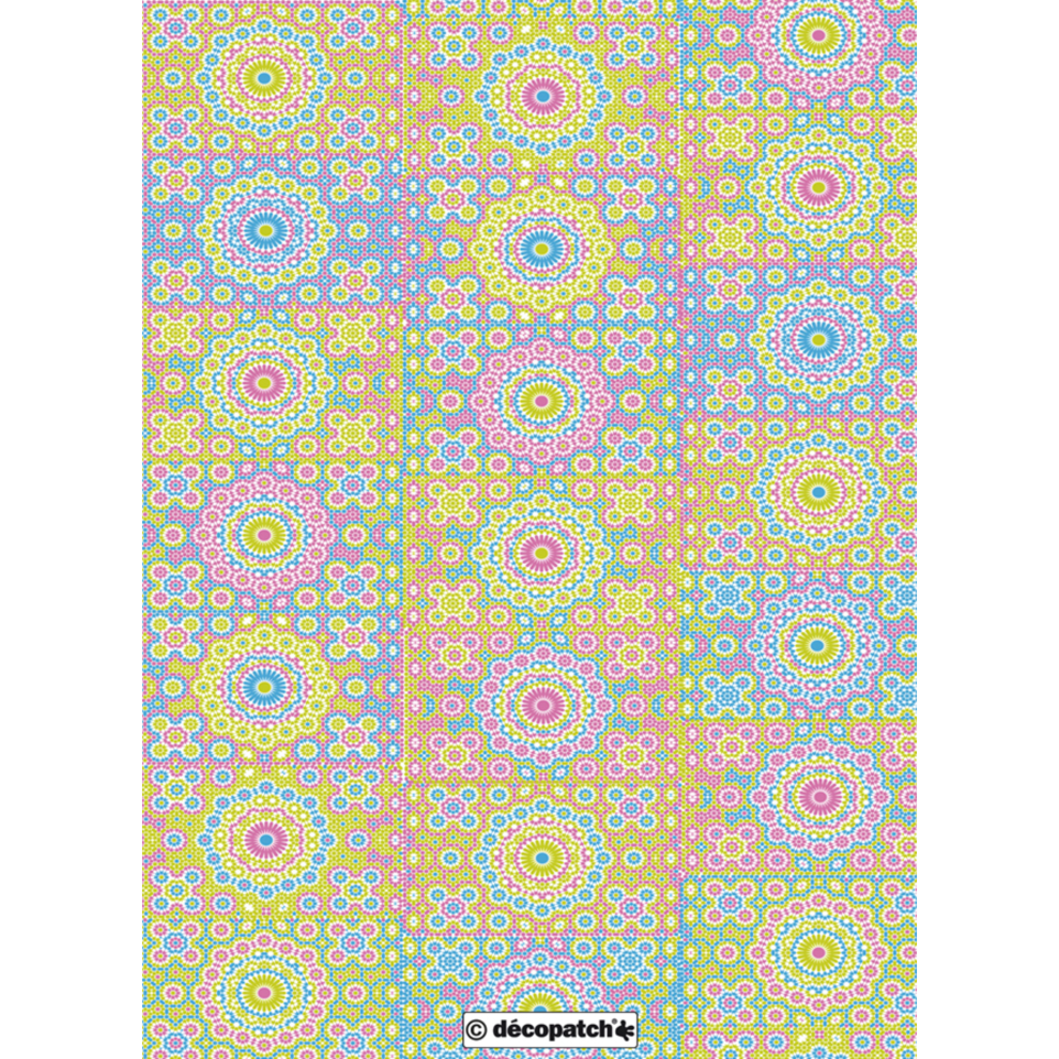 633 - Pochette 20 feuilles Décopatch Le papier Décopatch épouse parfaitement la forme de tous les objets (planes ou irrégulières) et sur toutes les matières (papier mâché, bois, plastique, fer, verre, polystyrène, métal, terre cuite, céramique, liège...). Très facile à appliquer grâce à sa finesse et à sa résistance une fois encollé, le papier Décopatch est l'unique papier à donner un aspect lisse et l'illusion d'une peinture à vos réalisations ! Fini le gachis ! Redonnez vie à vos objets démodés, abîmés ou défraîchis. Technique très facile : déchirez ou découpez quelques morceaux de papier Décopatch d'environ 2x2 cm - Appliquez le vernis-colle PaperPatch de la gamme Décopatch sur le support à décorer. Déposez un morceau de papier sur la surface encollée et mettre une deuxième couche de vernis-colle par-dessus. Répêter l'opération en superposant les morceaux de papier jusqu'à ce que l'objet soit totalement ou partiellement recouvert. Enfants de plus de 5 ans ou adultes, novices ou expérimentés, la technique Décopatch s'adapte à tous les âges et à tous les niveaux ! Créé et fabriqué en France
