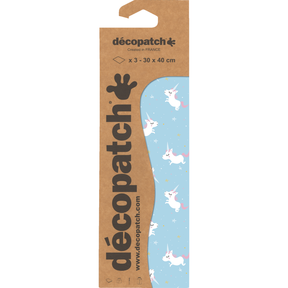 Décopatch 3 identieke bladen - ref 727. Het Décopatch papier kan op alle oppervlakken (plat of volumineus) en op alle materialen (papier, hout, plastic, ijzer, glas, polystyreen ...) toegepast worden. Zelfs op stof (katoen, linnen...) wanneer deze uitgerekt wordt! Het papier scheurt niet als het gelijmd is en de kleuren vervagen niet. Er is een motief voor elke decoratie....diverse trends, dots of strepen, uni of patronen, pop of savanne-versie ...! Het papier is zeer eenvoudig aan te brengen dankzij haar fijne structuur en weerstand. Eenmaal gelijmd is het Décopatch papier het enige papier dat de illusie van een schilderij wekt en uw creatief werk een professionele uitstraling geeft !