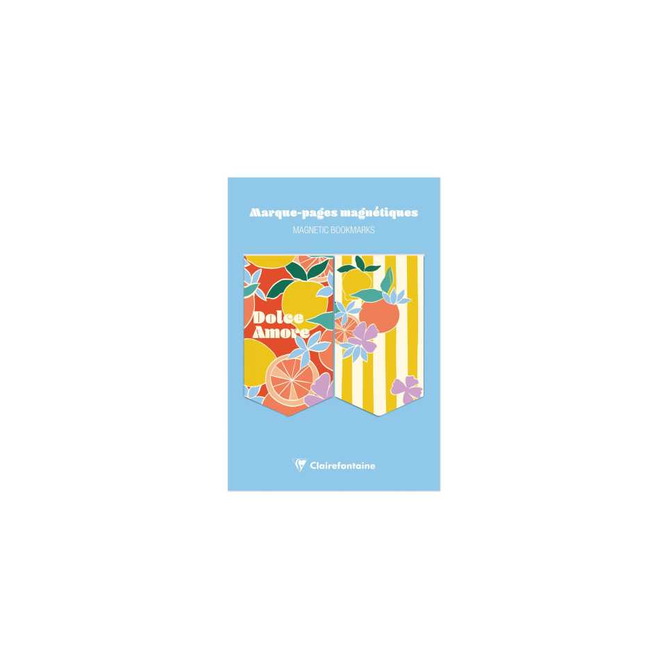 Dolce Amore, set van 2 magnetische bladwijzers 10,5x15,5 cm Laat je betoveren door Dolce Amore, een sprankelende collectie die je meeneemt naar een eindeloos zomers avontuur, vol kleur en levensvreugde! Deze collectie brengt je naar het hart van Zuid-Italië, waar de zon stralend schijnt en de sfeer vol warmte en positiviteit is. Geïnspireerd door de levendige straatjes van Italiaanse dorpjes, de geurige citrusvruchten en het zorgeloze leven, brengt Dolce Amore de vreugdevolle momenten tot leven. De fleurige, gestreepte en frisse citrusmotieven, met stralende citroenen en levendige kleuren, geven je dagelijks leven die typische dolce vita-vibe. Elke creatie voelt als een uitnodiging om te genieten van het moment, met een vleugje Italiaanse flair! Of je nu romans, documenten of notitieboekjes leest, deze set van 2 magnetische bladwijzers voegt een verfijnde touch toe aan je lee smomenten. Handige bladwijzers om jezelf of echte leesliefhebbers cadeau te doen! 2 geassorteerde motieven. PEFC-gecertificeerd karton met satijncoating.