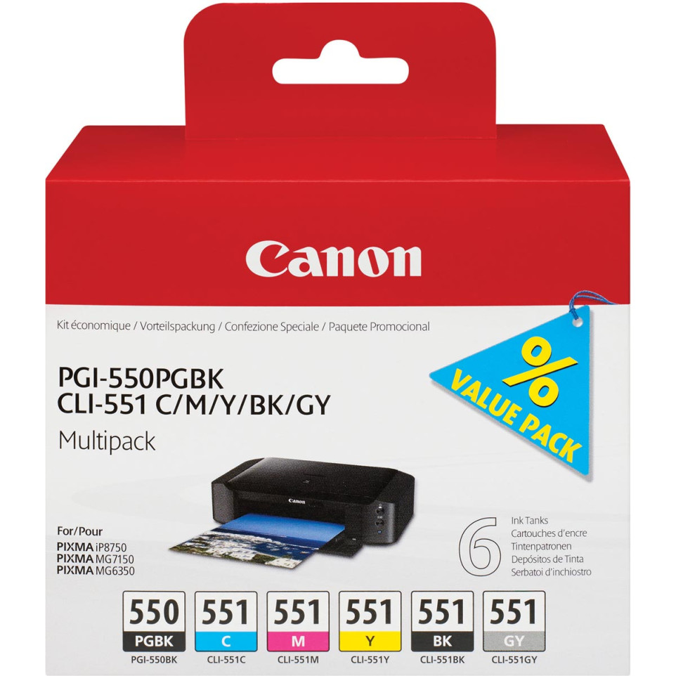 Canon inktcartridge PGI-550PGBK+CLI-551 is een origineel inkt budgetpack bestaande uit pigment zwart, fotozwart, cyaan, magenta, geel en grijs. Geschikt voor Canon PIXMA iP8750, MG6350, MG7150 en MG7550 printers. Ideaal voor wie zowel scherpe documenten als levendige foto's wil printen.