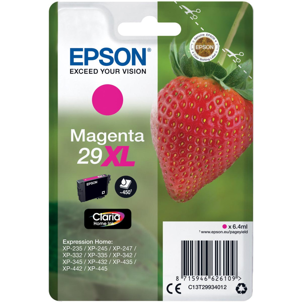Epson inktcartridge 29XL (C13T29934012) is een originele high-capacity magenta cartridge, geschikt voor een breed scala aan Expression Home-printers zoals de XP-235, XP-332, XP-335, XP-432 en XP-435. Ideaal voor wie regelmatig veel kleurenprints maakt en op zoek is naar een betrouwbare en voordelige oplossing.