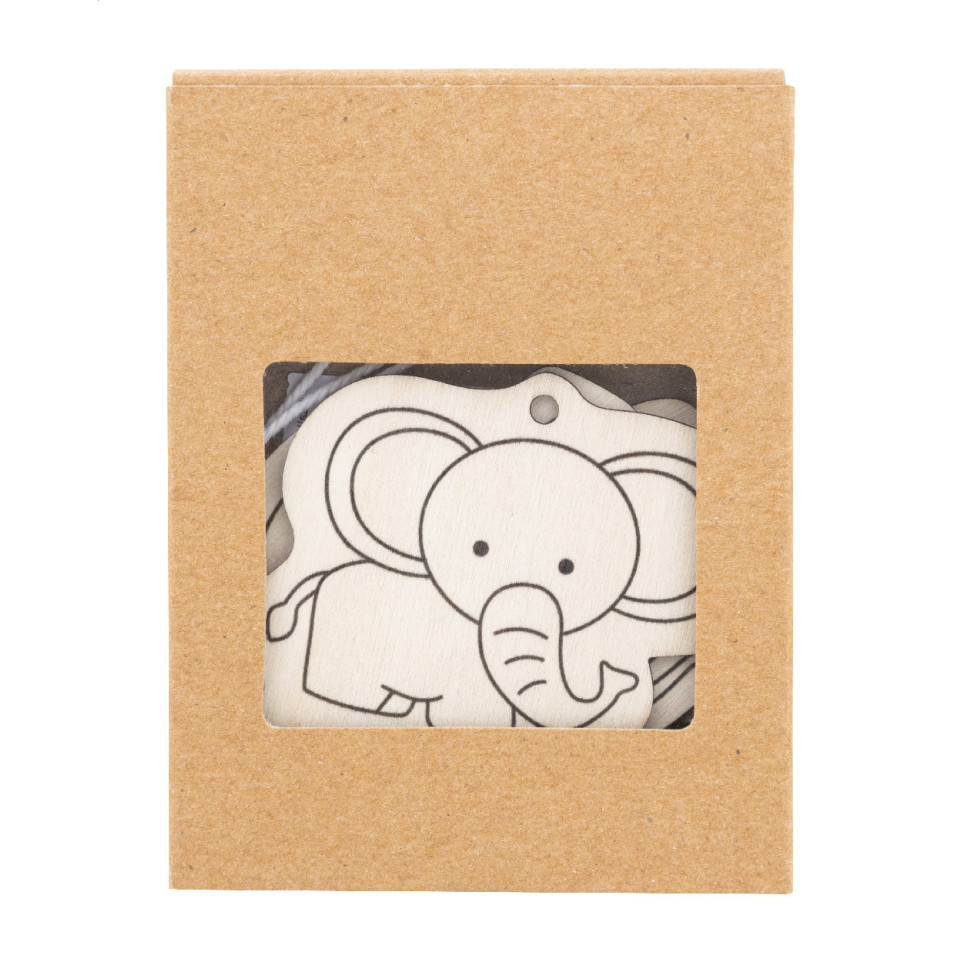 De set bevat drie houten dierenfiguren, vier houten kleurpotloden, ophangkoorden en een kraftpapier doos.