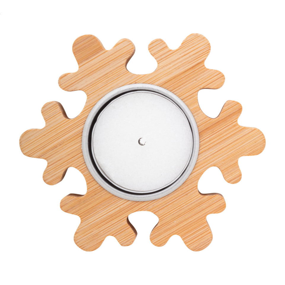 Bamboe waxinelichthouder in kerstuitvoering, voorzien van een sneeuwvlokmotief. Inclusief naar vanille geurende, plantaardige waxinelicht. Geschikt voor sfeervolle feestdecoratie en cadeaugebruik.