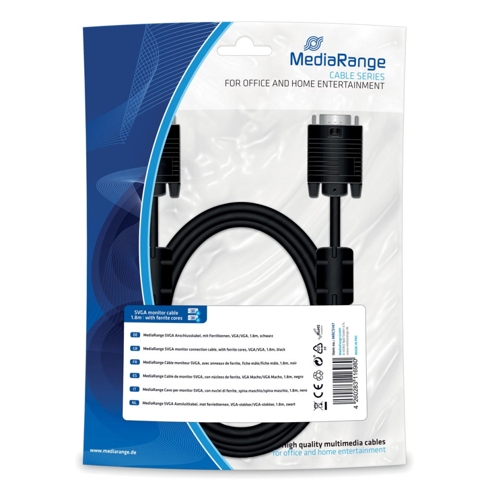 SVGA aansluitkabel van MediaRange, geschikt voor het verbinden van computers en monitoren met een SVGA-poort. De kabel heeft een lengte van 1,8 meter en is uitgevoerd in zwart textiel met ferrietkernen voor optimale signaalkwaliteit.