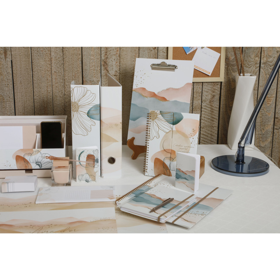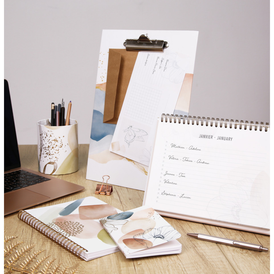 Evanescence, Porte-bloc 23x33cm Edith Duprez-Chenu est créatrice de motifs et illustratrice chez Edith and Co Design. Passionnée par les couleurs, les matières, les motifs dans tout ce qui l'entoure, Edith Duprez s'efforce de capturer la beauté de la vie à travers des coups de pinceau fluides et intuitifs. Pour cela, elle affectionne particulièrement l'aquarelle, ce medium qui a sa propre expression, sa délicatesse et qui révèle des couleurs imprévisibles ! Dans cette nouvelle collection, Edith mêle formes géométriques et abstraites, line art et paysages aquarellés dans des nuances de rose, beige, ocre et bleu. Ces teintes poudrées sont sublimées par des touches dorées pour un rendu plein de douceur. 1 visuel paysage bleu. Fabriqué à base de carton certifié PEFC, pelliculage satiné, sérigraphie or. Pratique, il est suffisamment rigide pour permettre la prise de note en toute situation. Un petit trou derrière la pince permet d'accrocher le porte-bloc sur un crochet mural.