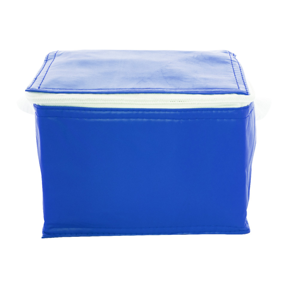 Compacte, blauwe koeltas van PVC met aluminium voering, ontworpen voor het koel houden van zes blikjes van 0,33 liter. Ideaal voor onderweg, tijdens picknicks, op kantoor of bij andere outdooractiviteiten.