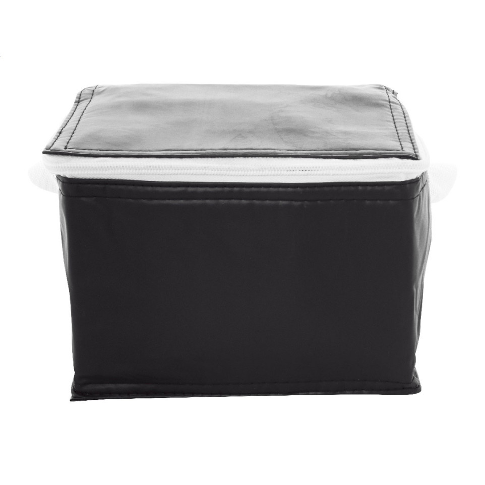 Compacte, zwarte PVC koeltas met aluminium voering, geschikt voor het gekoeld vervoeren van 6 blikjes van 0,33L. Ideaal voor onderweg, op reis, tijdens uitstapjes of op kantoor.