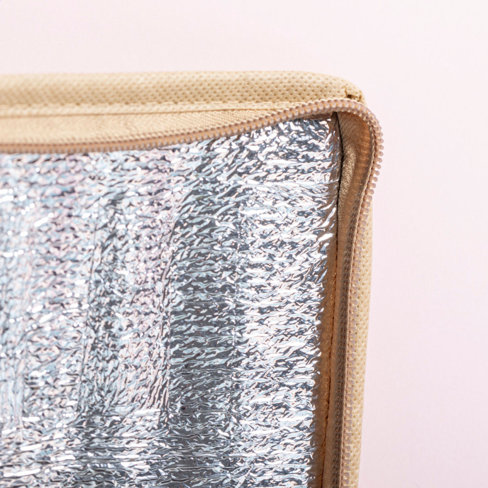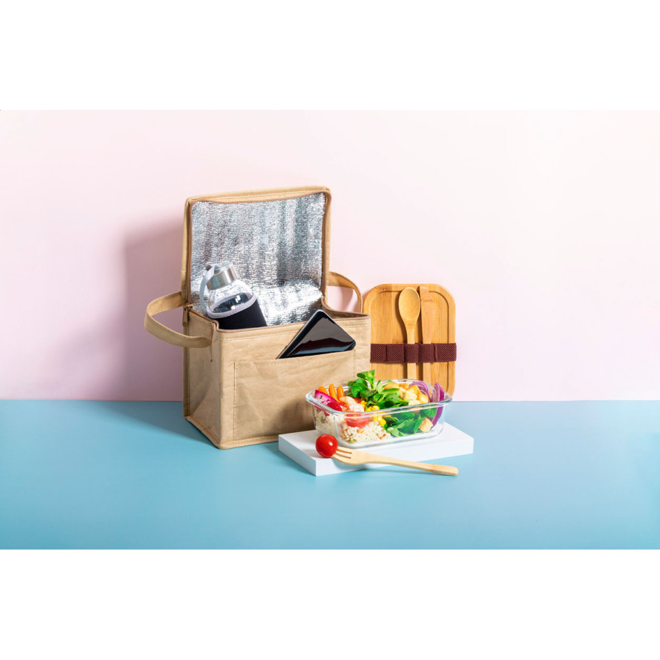 Handzame, ritssluitbare koelertas in gelamineerd gerecycled papier met aluminium voering en een handig voorvak. Ontworpen om 6 blikjes van 0,33 l fris of bier koel te houden tijdens picknicks, op kantoor, onderweg of buitenevents.