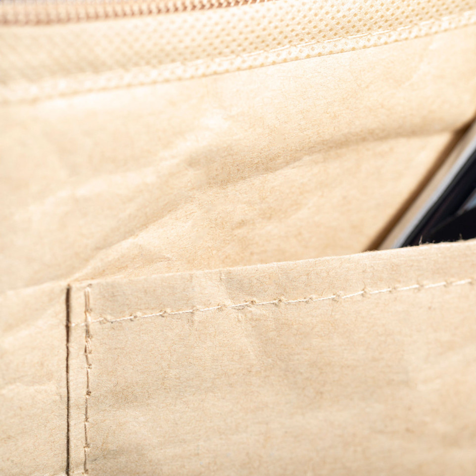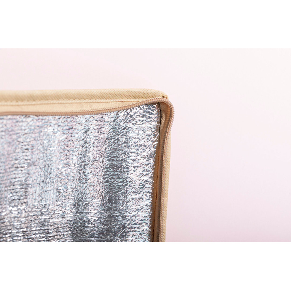 De tas is gemaakt van gelamineerd gerecycled papier met een aluminium binnenzijde voor optimale isolatie.