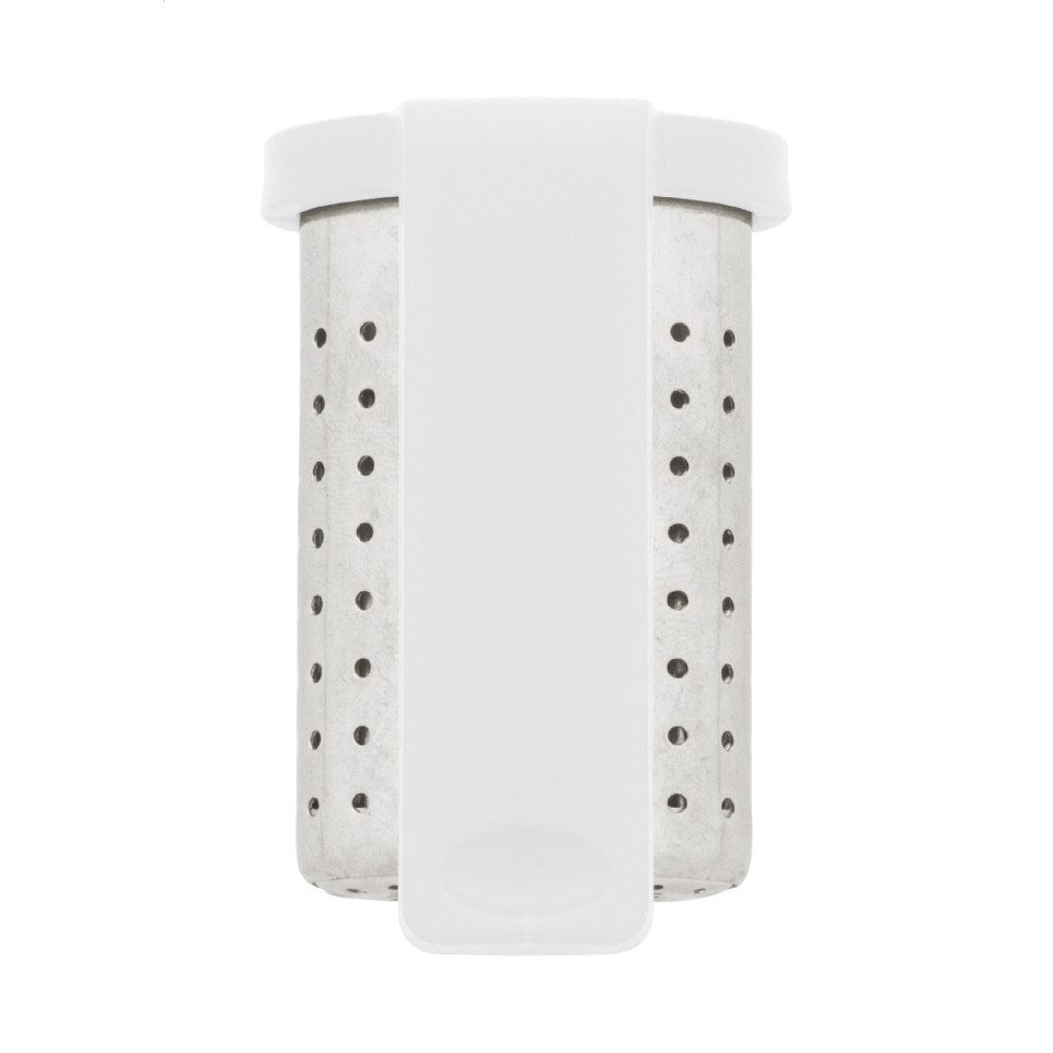 Praktische thee-infuser van roestvrijstaal met cliphouder in gerecycled ABS, ontworpen voor eenvoudige bevestiging aan de rand van een mok. Ideaal voor het bereiden van losse thee op kantoor, thuis of onderweg.