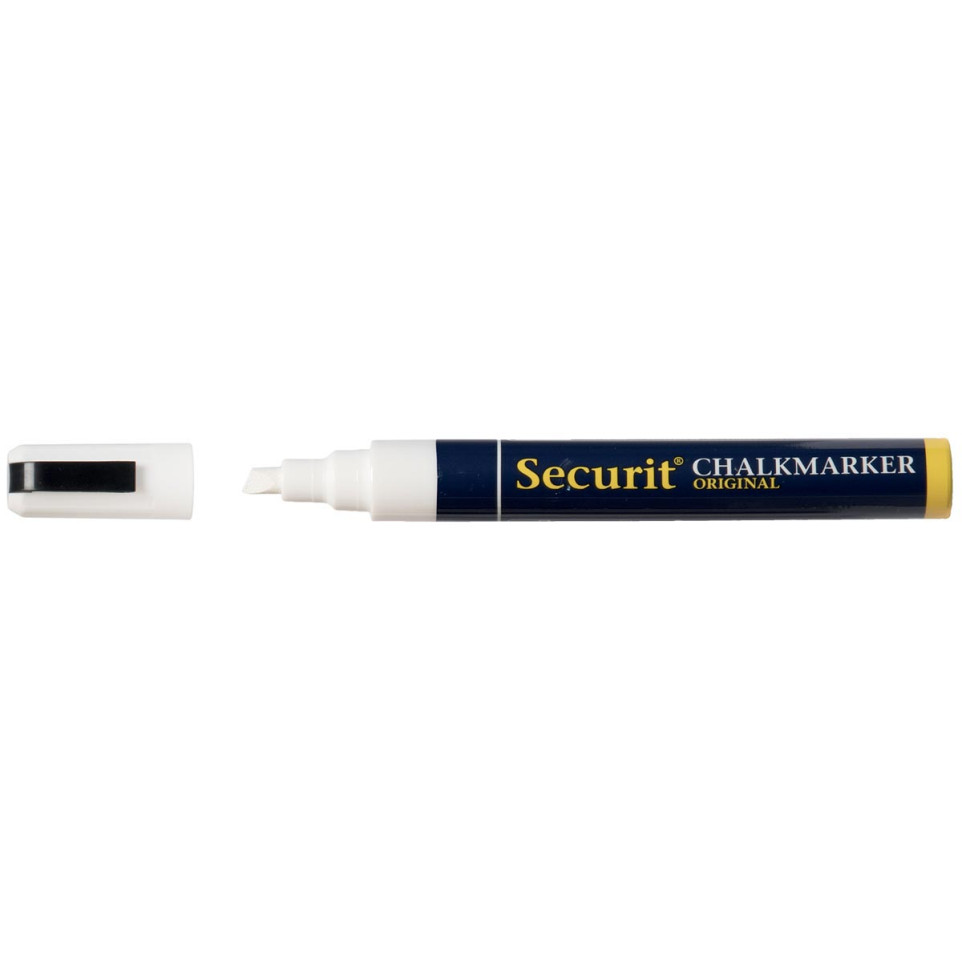 Om de Securit Krijtmarker Medium, Wit te gebruiken, trek je eenvoudig de dop van de marker en schrijf je met de krijt op het gewenste oppervlak. De krijt laat een duidelijke markering achter zonder veel vlekken te maken. Na gebruik kun je de marker opbergen in de plastic houder, klaar voor het volgende gebruik. De marker is gemakkelijk te reinigen met water, maar let op dat hij niet op bepaalde oppervlakken vlekken kan maken.
