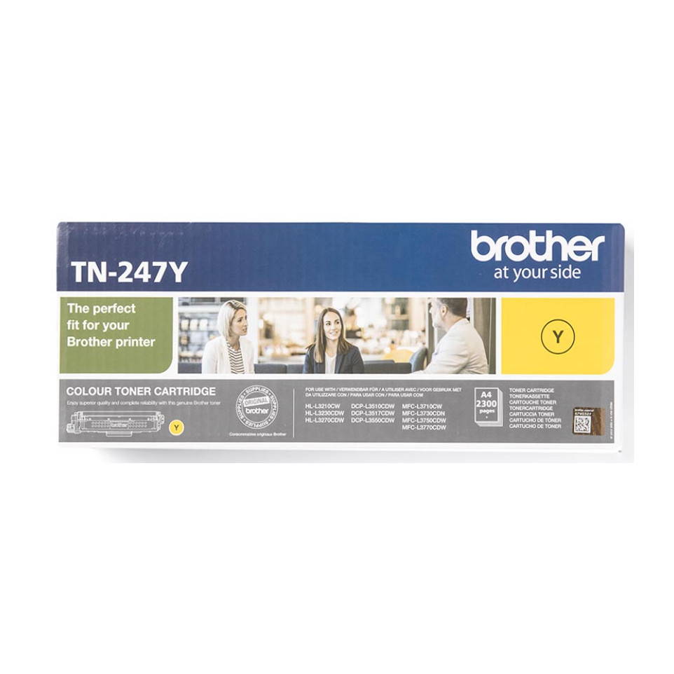 Plaats de TN-247Y toner in uw Brother kleurenlaserprinter uit de HL-L3200 of DCP/MFC-L3500/L3700 series. De cartridge klikt vast in het tonervak en is direct klaar voor gebruik. Toner geschikt voor veeleisende kleurafdrukken, presentaties en dagelijks kantoorgebruik. Vervang de cartridge wanneer het printersysteem aangeeft dat de toner bijna op is.