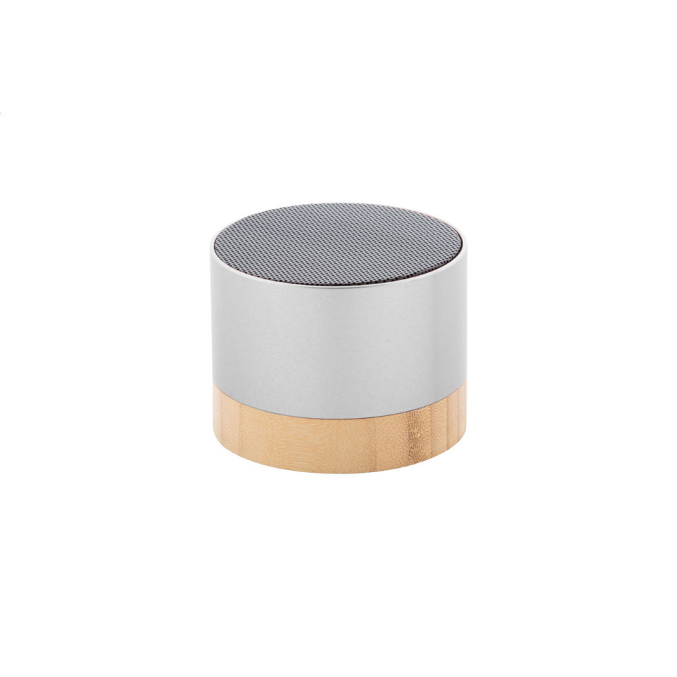 RalooBeat bluetooth speaker in gerecycleerd aluminium met bamboe basis. Een krachtige 3W draadloze luidspreker in zakformaat met verrassend helder geluid. De perfecte combinatie van duurzaamheid en stijlvol design voor muziek onderweg.