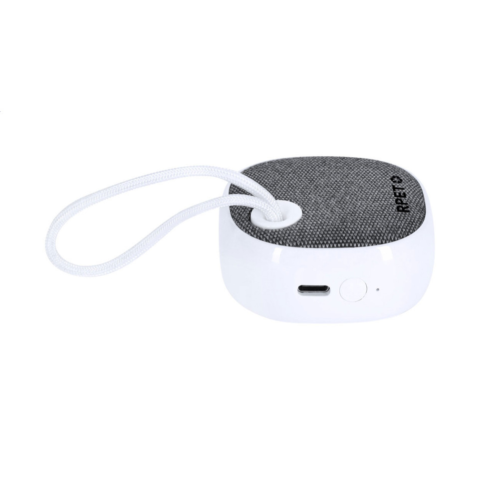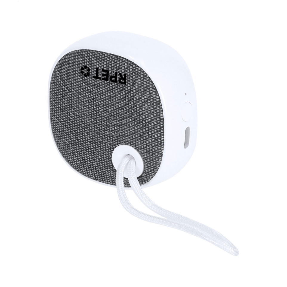 Draagbare bluetooth speaker van gerecycled ABS-kunststof met RPET-polyester zijkant, ingebouwde zonne-oplader en handige draagriem. Uitgerust met een oplaadbare 300 mAh-accu en geleverd inclusief USB-oplaadkabel. Ideaal voor mobiel gebruik buitenshuis, op kantoor of onderweg.
